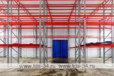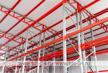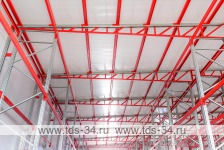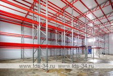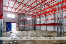 Быстровозводимый самонесущий склад на базе обычных фронтальных паллетных стеллажей. Устанавливается на сварных кровельных фермах. Имеет высоту 6 метров.